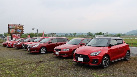 手前のズングリとした変なやつ(?)は、 乗り換えたのに居残っているスタッフのクルマ。(汗) |