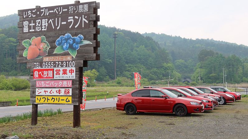 いちご狩り会場の駐車場にて。 参加車すべてを並べたところです。6台(+1台) |